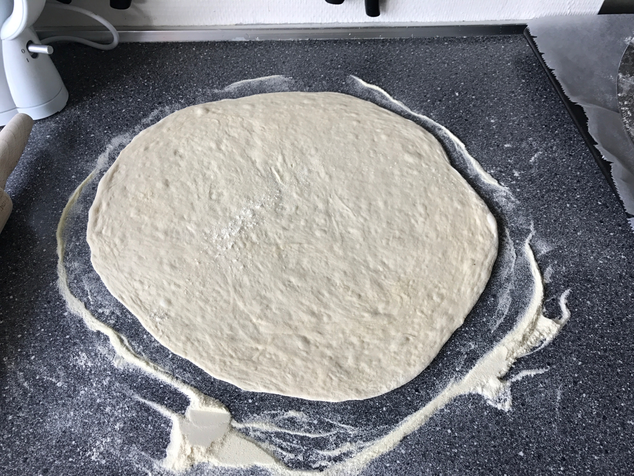 Ingredienserne blandes sammen i den rækkefølge de er nævnt. Det giver en mængde der svarer til 4 pizzaer, men jeg laver kun 3 ud af dem for så kan jeg få nogle større pizzaer end normalt. Jeg lader dejen stå i en skål i stuen og hæve. 2 timer inden pizzaerne skal laves bliver dejen delt op i det antal pizzaer jeg vil lave og får lov at efterhæve på bagepapir i en slukket ovn.